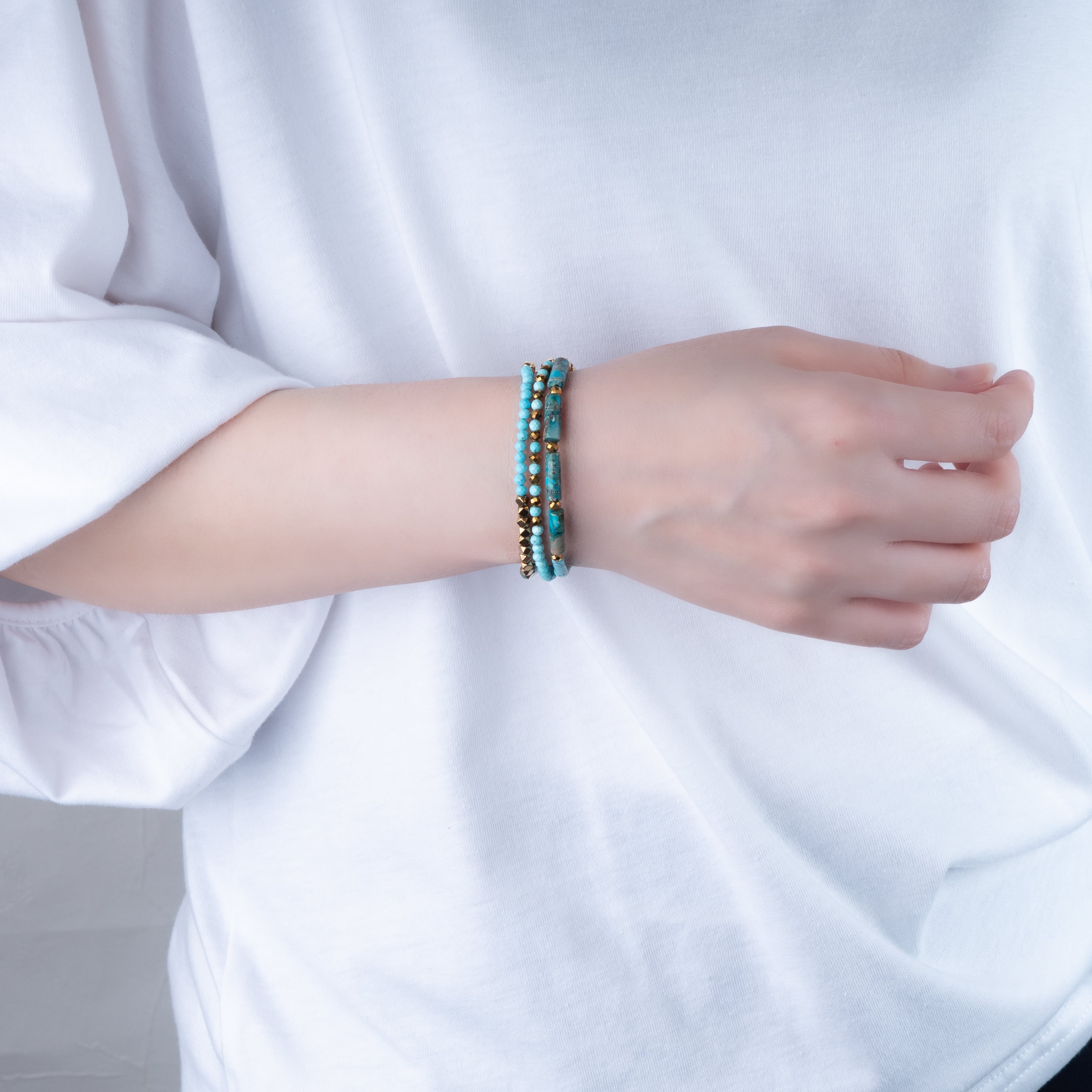 3種の合成ターコイズを組み合わせたリズミカルなデザイン。