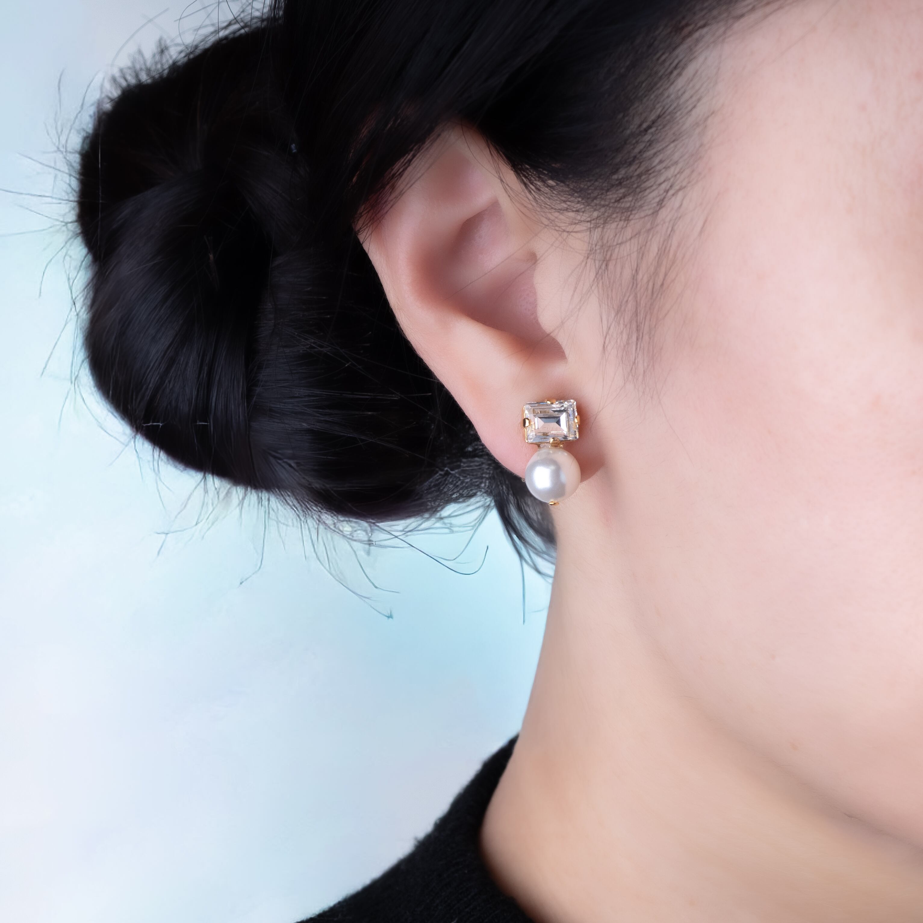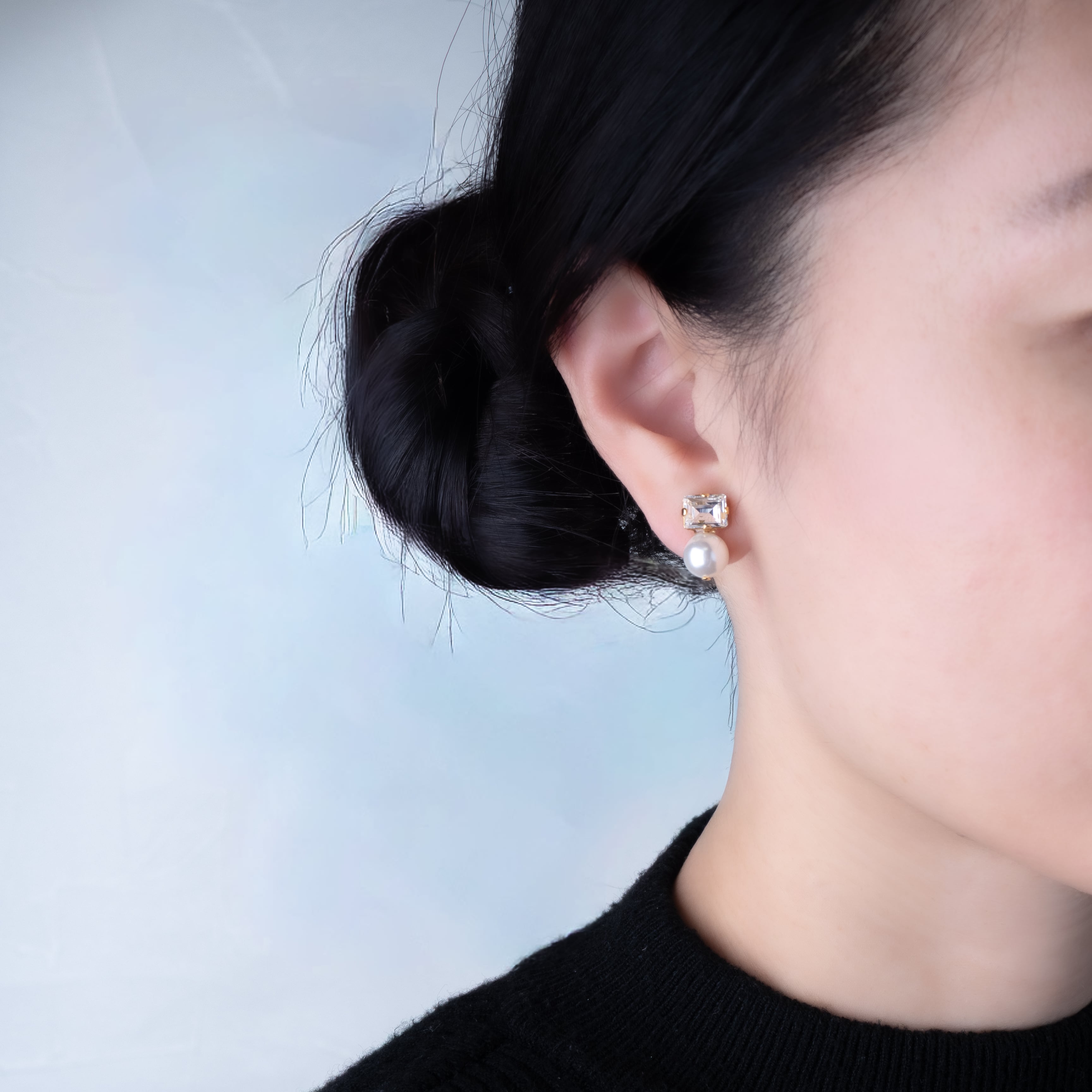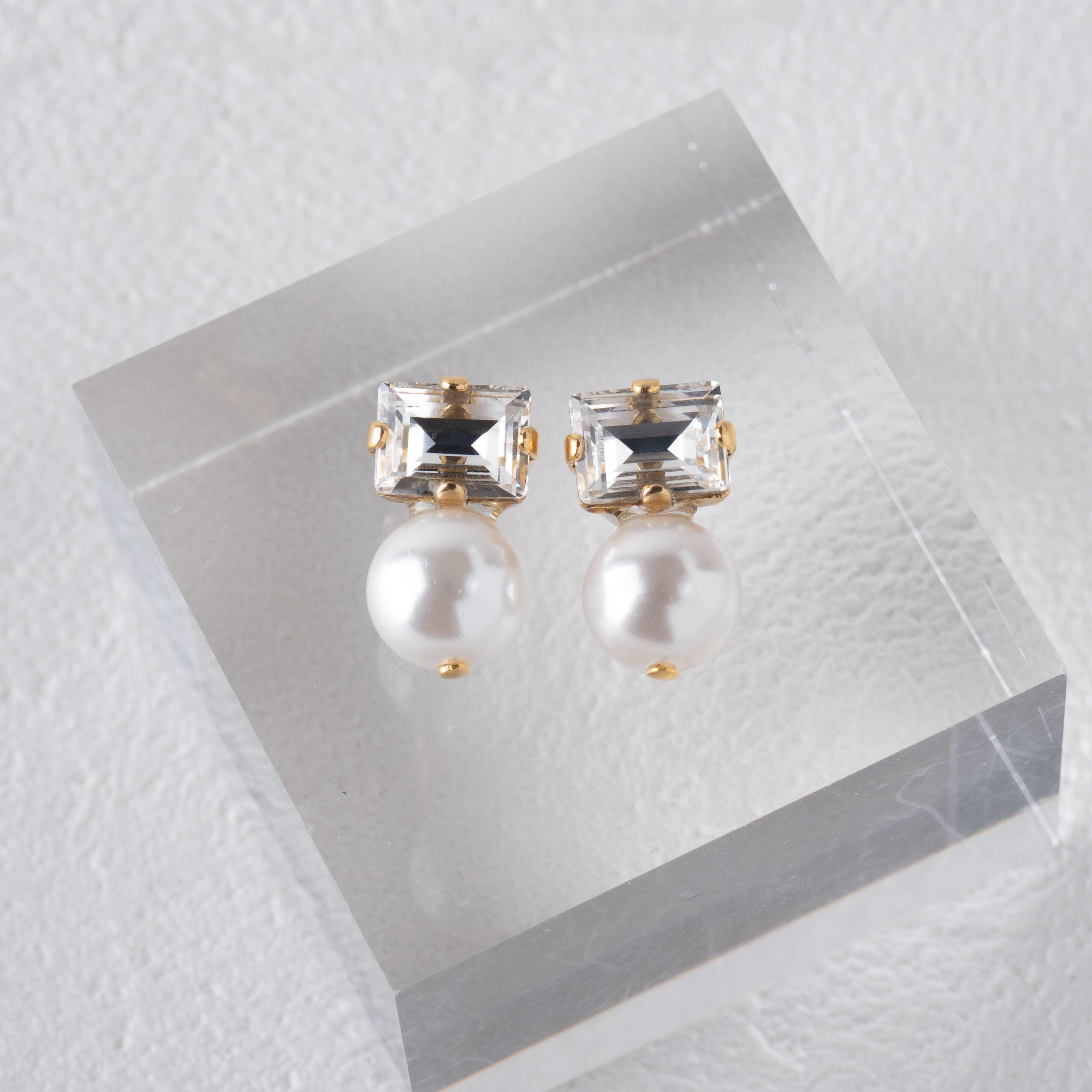 横クリスタル×貝パール ピアス(イヤリング変更可)